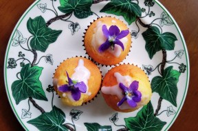 ニオイスミレのマドレーヌは、アイシングをかけ、ニオイスミレを飾るだけです。